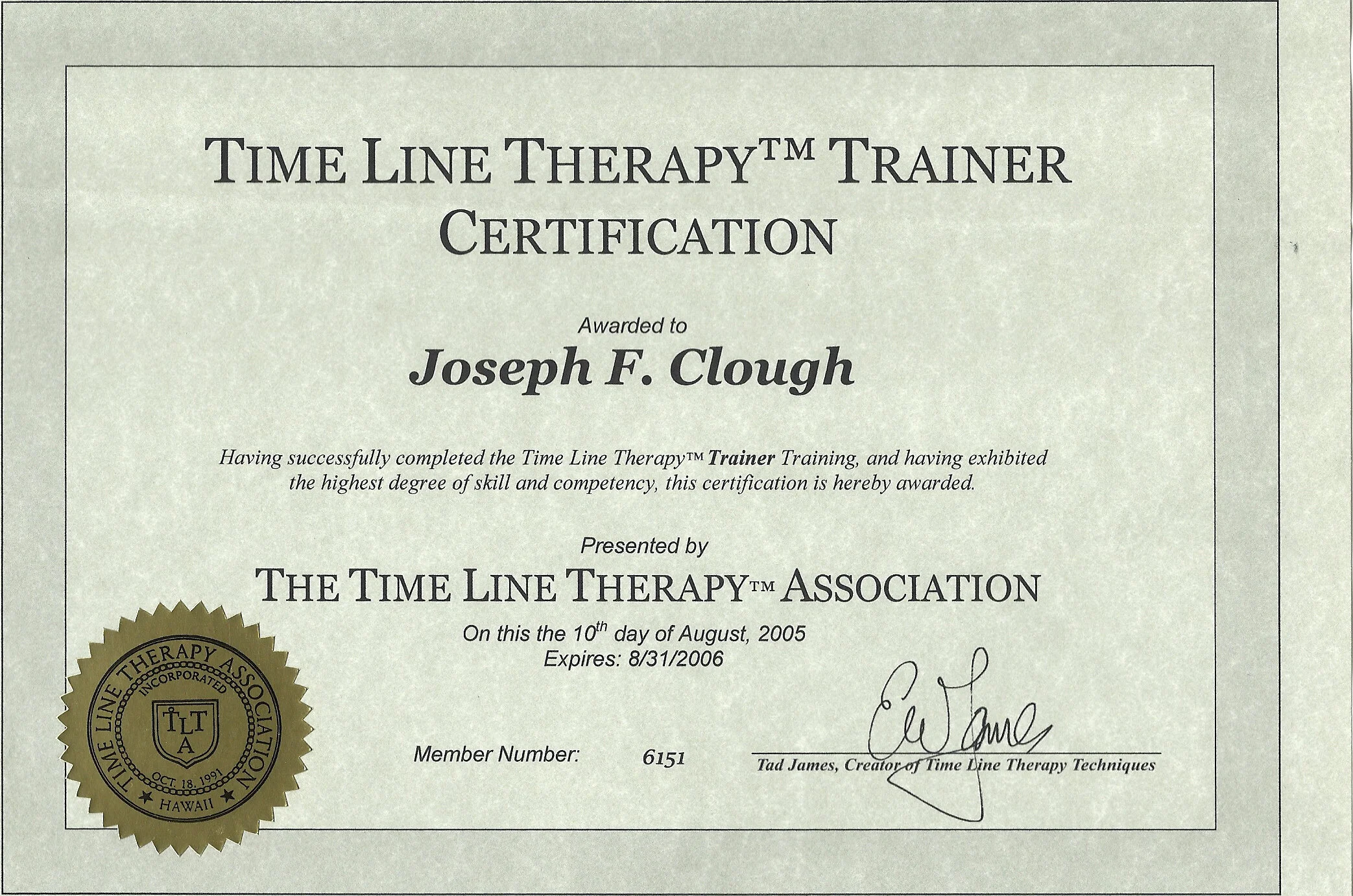 Certified Master Trainer of Time Line Therapy™: Tad James Company